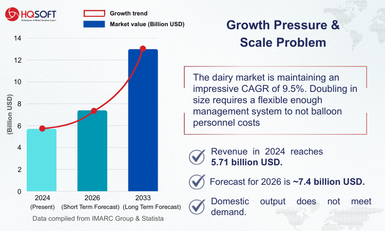 Amid global economic volatility, the projected scale of USD 13.37 billion by 2033 for Vietnam’s dairy industry is not only a promising figure, but also a massive pressure on operational systems. For management teams, the key question is no longer “how to grow,” but “how to grow profitably” by tightening costs and optimizing the distribution chain.